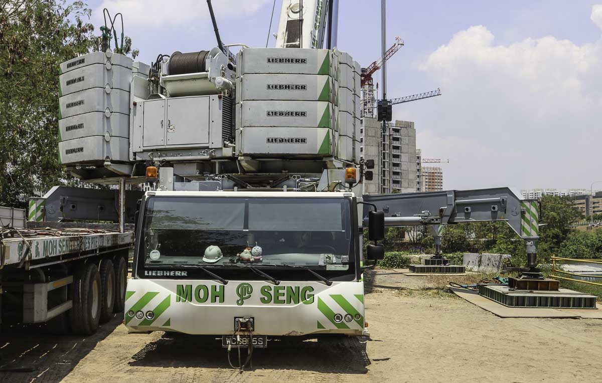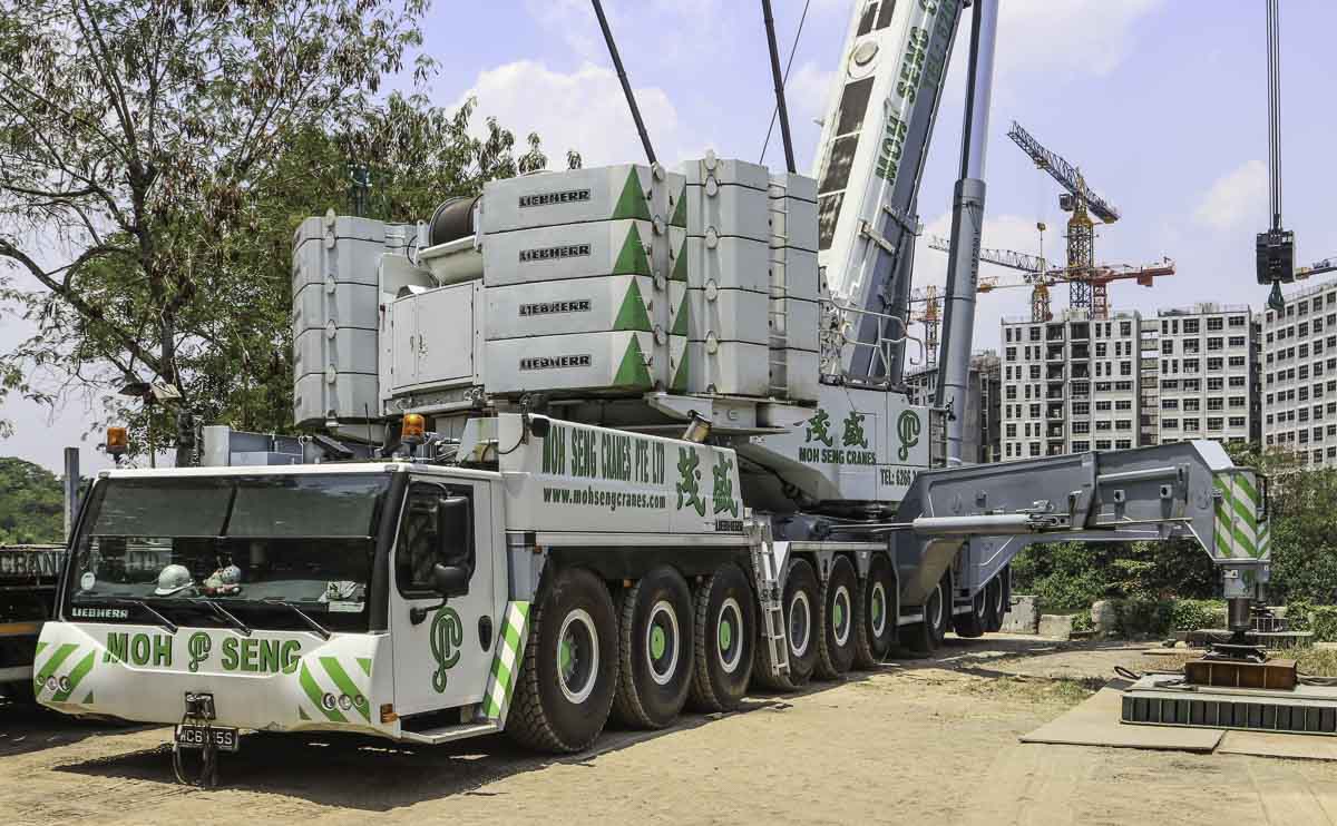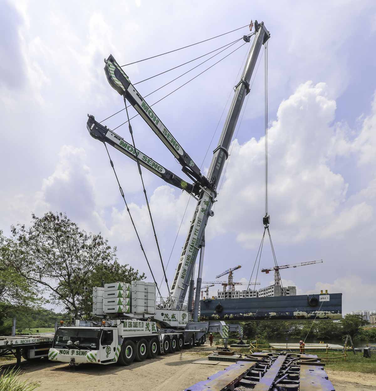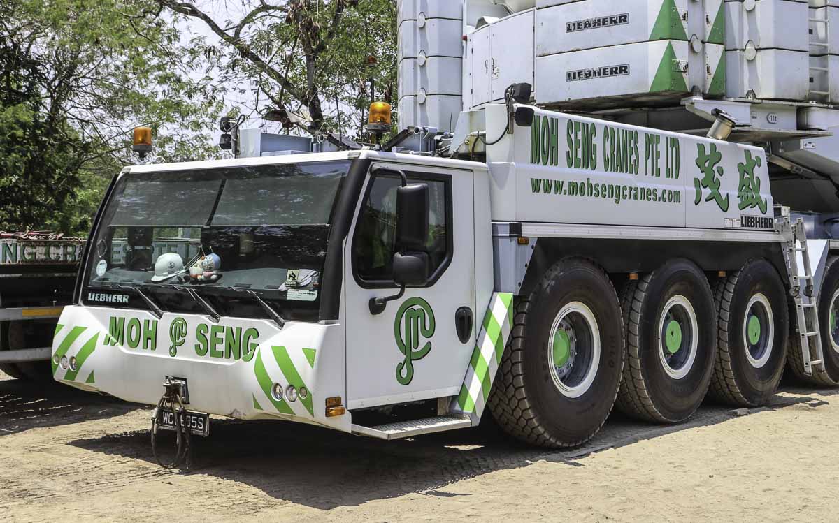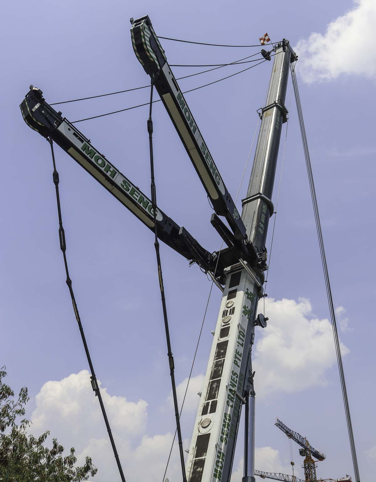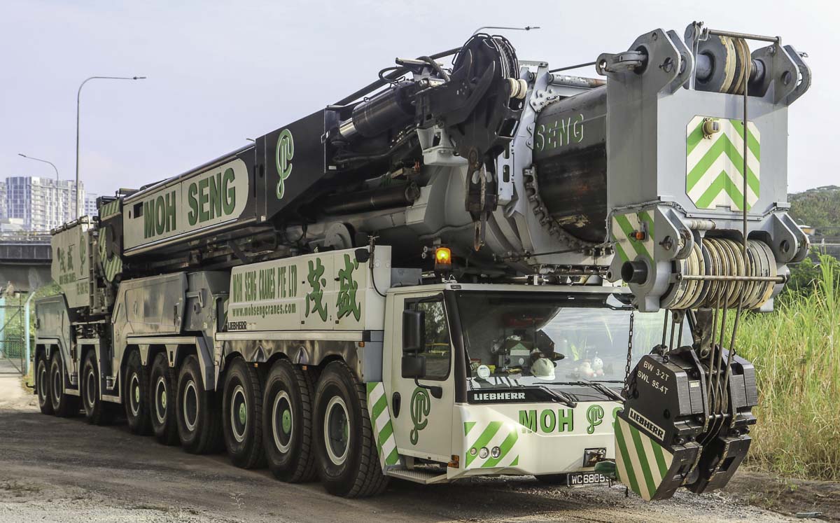 De fraaie Liebherr LTM 1750-9.1 van Moh Seng uit Singapore (SG) zou voor het hijsen van een paar pontons ingezet gaan worden. Hier is de kraan op de bouwplaats aangekomen.