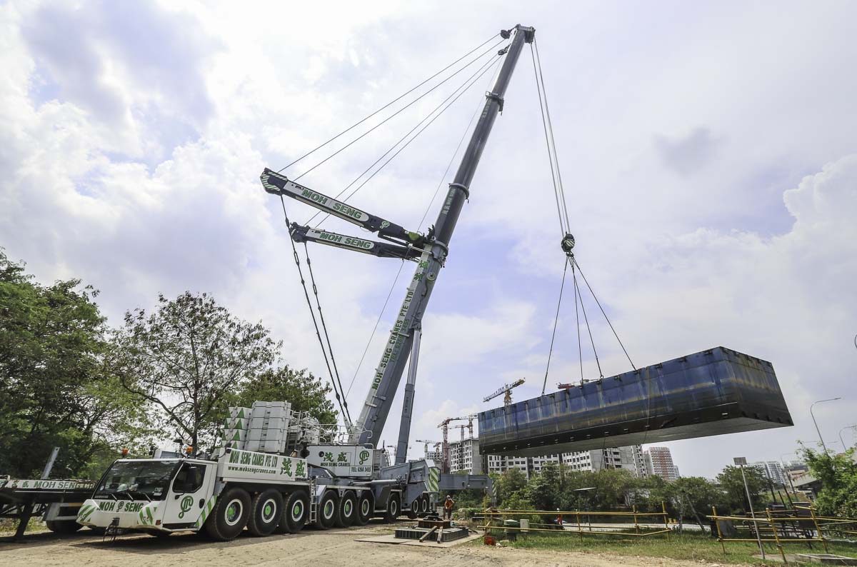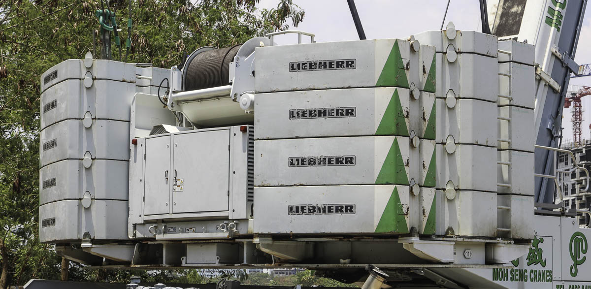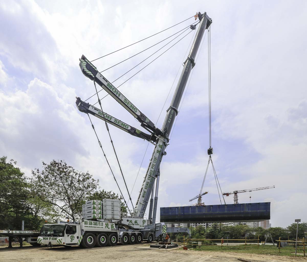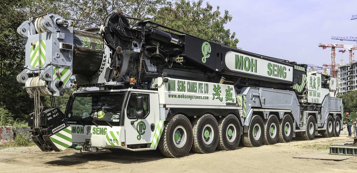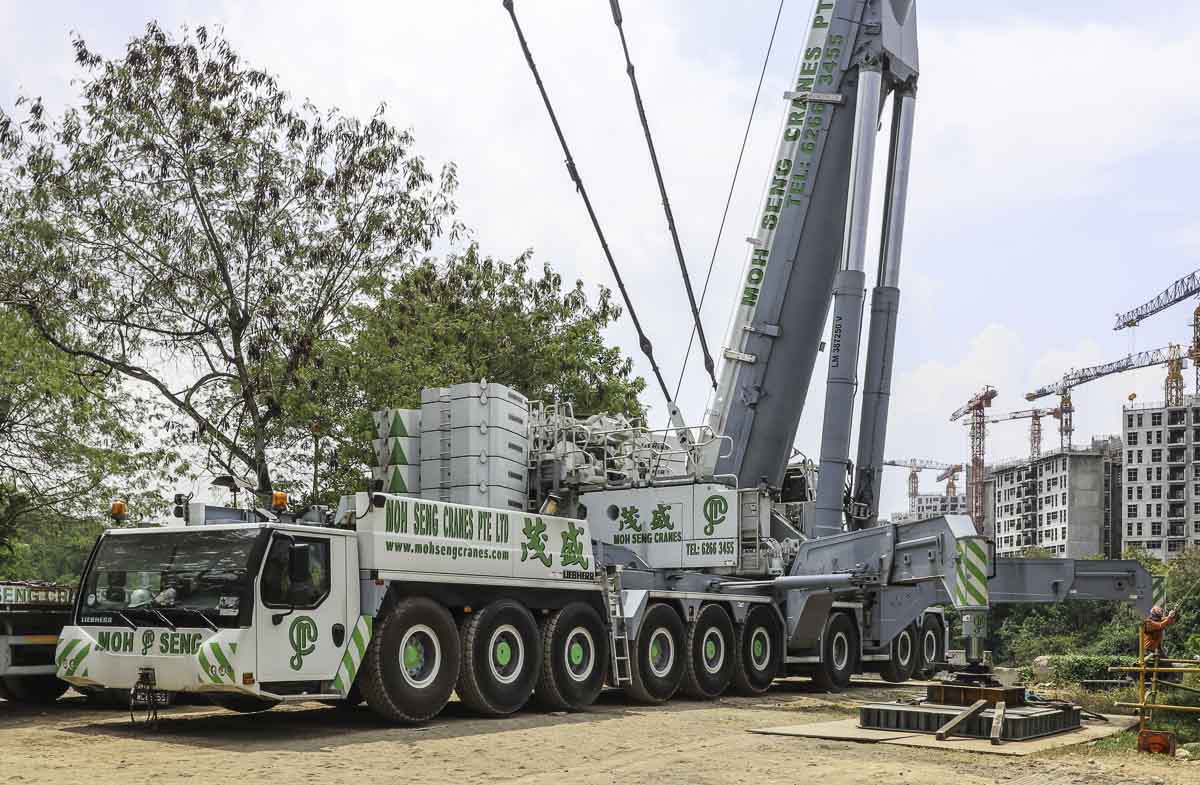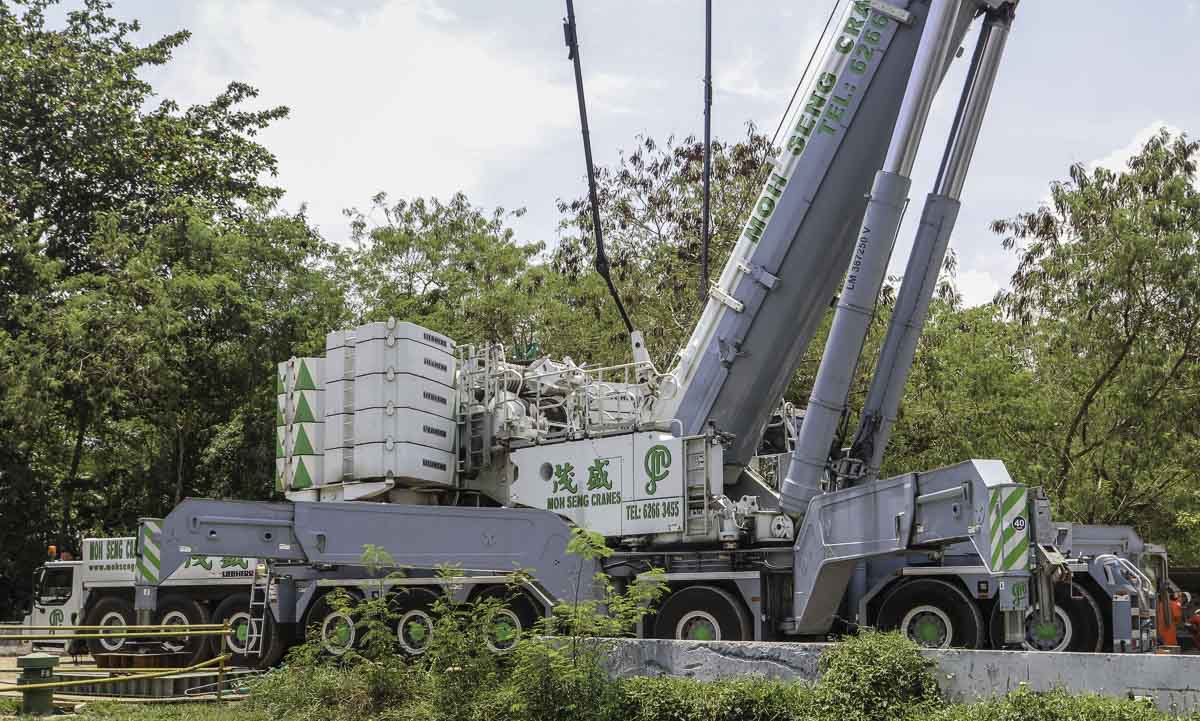 De fraaie Liebherr LTM 1750-9.1 van Moh Seng uit Singapore (SG) zou voor het hijsen van een paar pontons ingezet gaan worden. Hier is de kraan op de bouwplaats aangekomen.