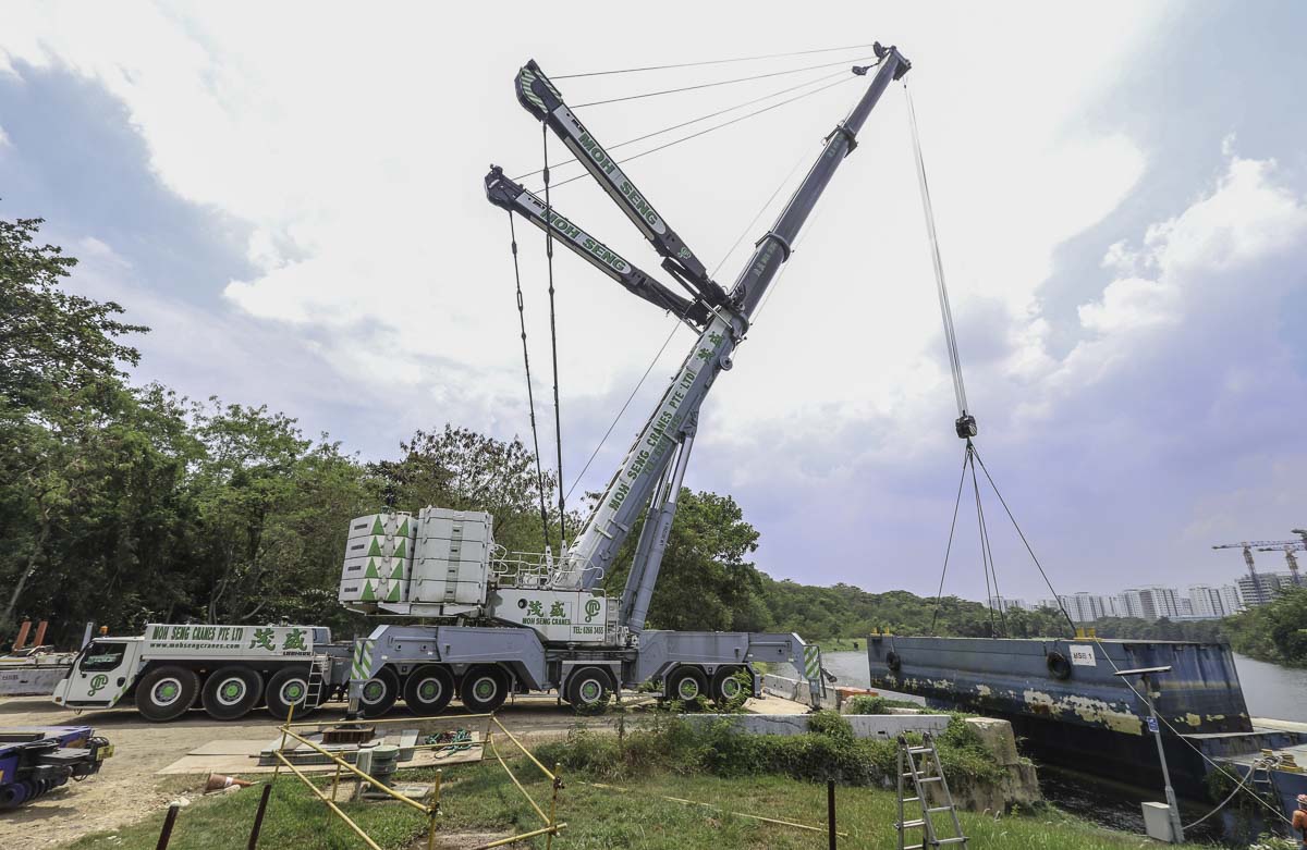 De kraan moest enkele pontons uit het water hijsen. Eerder zag ik dezelfde actie op dezelfde locatie door de Liebherr LTM 1750-9.1 van Bok Seng.