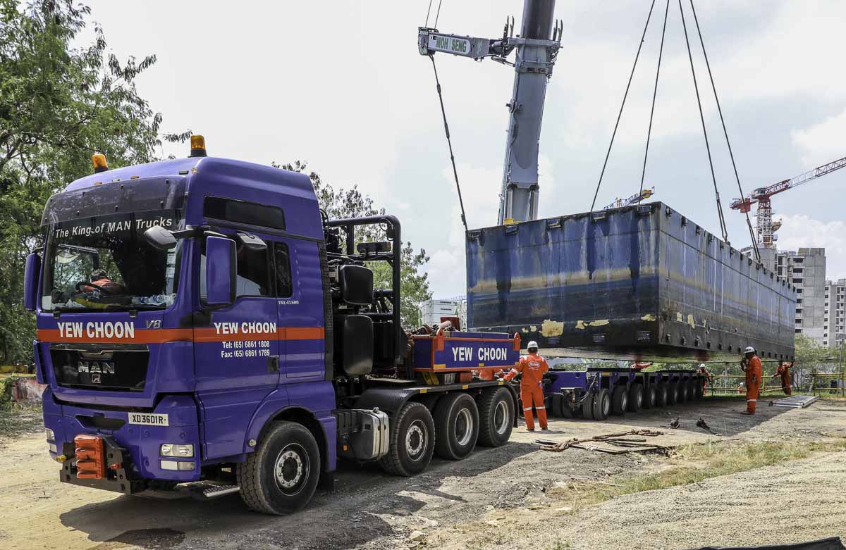 De pontons worden op combinaties van Yew Choon geladen, zij zette deze fraaie MAN TGX 41.680 met een 9-assige moduletrailer in. Het transport over de openbare weg zou pas 's avonds plaats vinden.