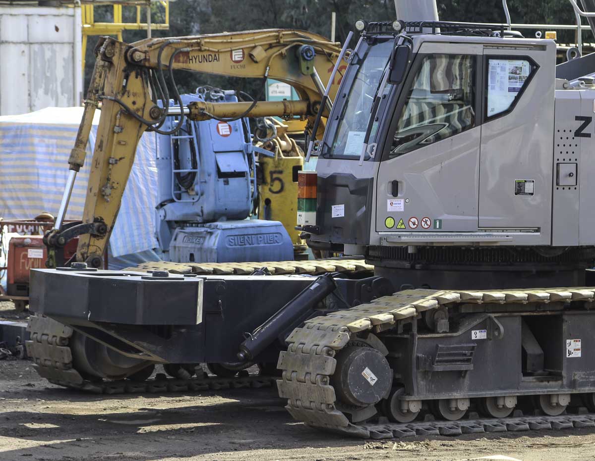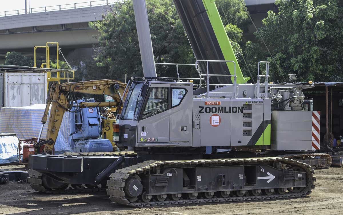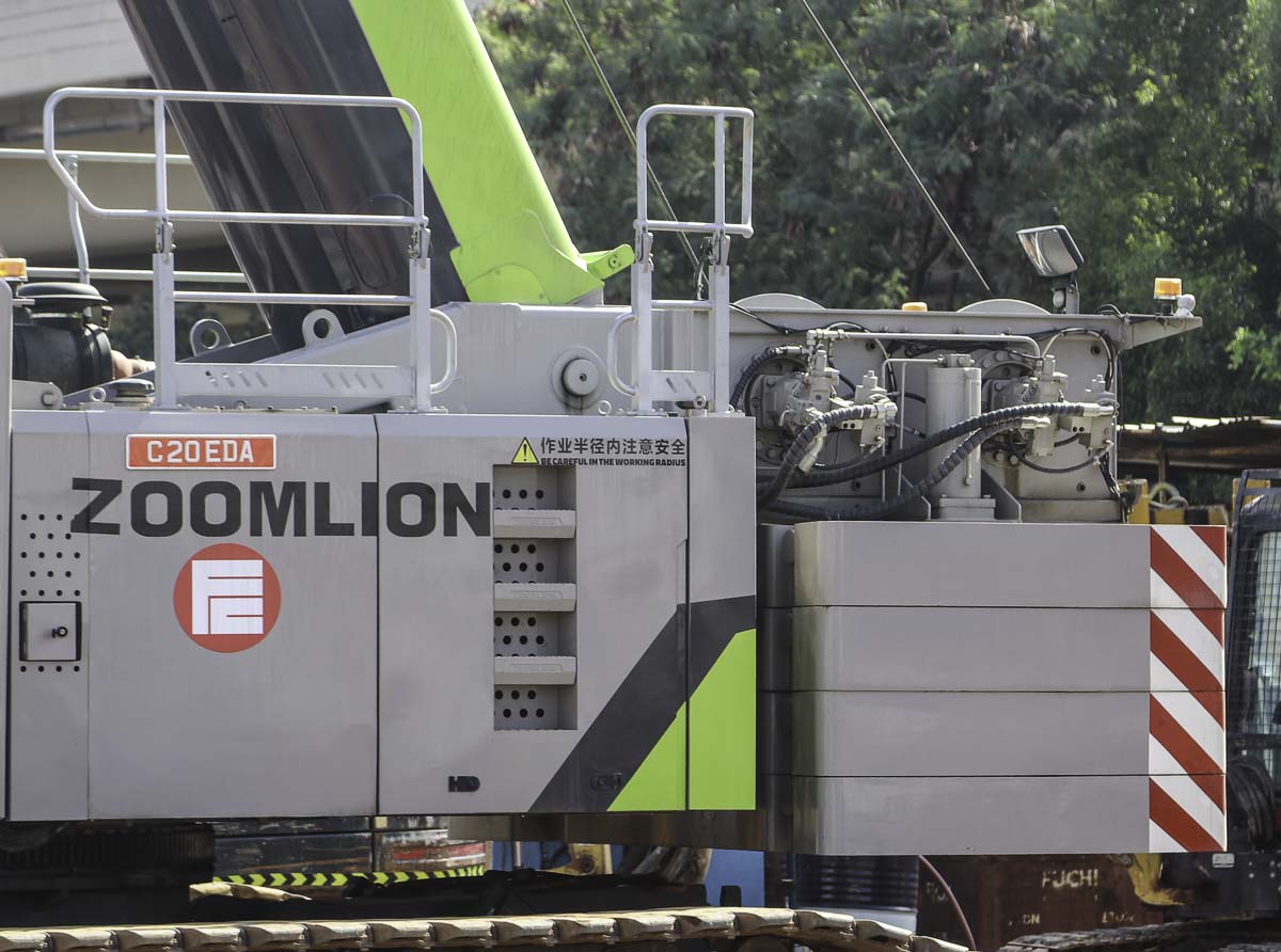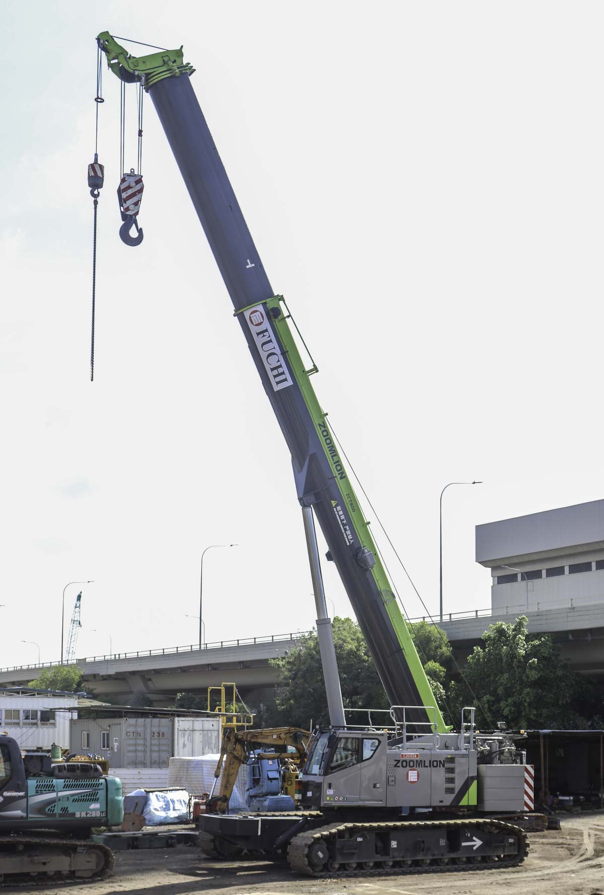Deze fraaie Zoomlion ZCT900V is van Fuchi uit Singapore (SG) en stond op hun werf geparkeerd. Het is een 90-tons telescoopkraan op rupsonderwagen. De onderwagen is 6,34 meter lang en 5,1 meter breed.