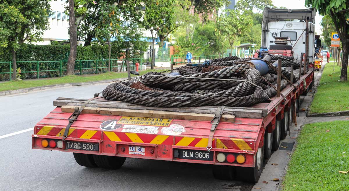 Deze fraaie Scania 144 G 460 van Centre Side Express (CSE) uit Kemaman (MY) kwam naar Singapore (SG) om wat zware staalstroppen bij een firma te leveren die hijsmateriaal voor de offshore levert. De combinatie bestaat uit een 3-assige truck met een 7-assige oplegger.