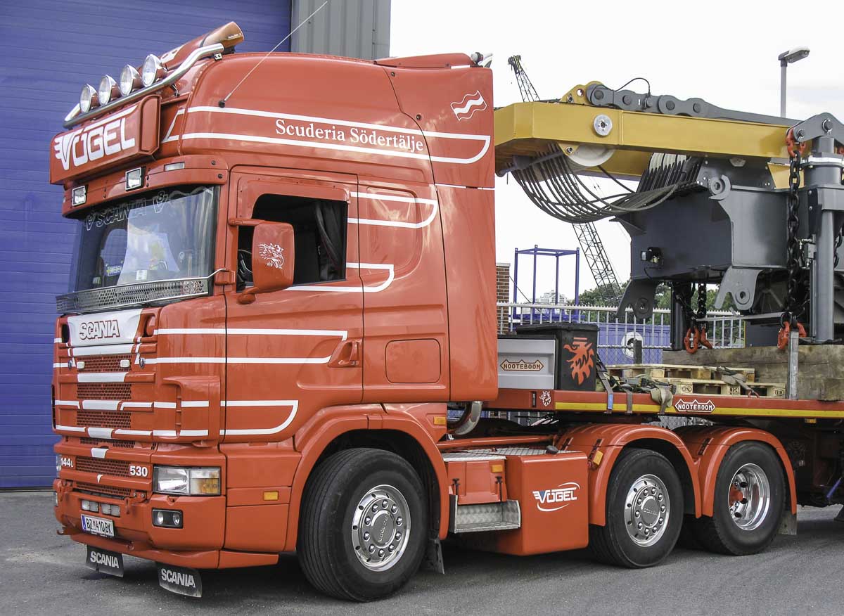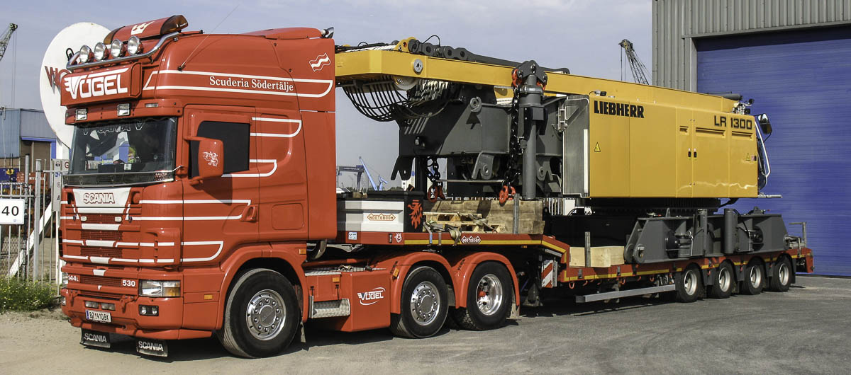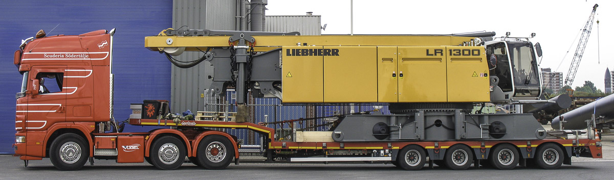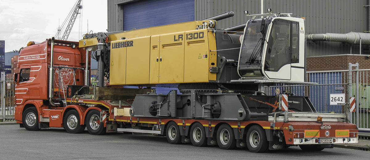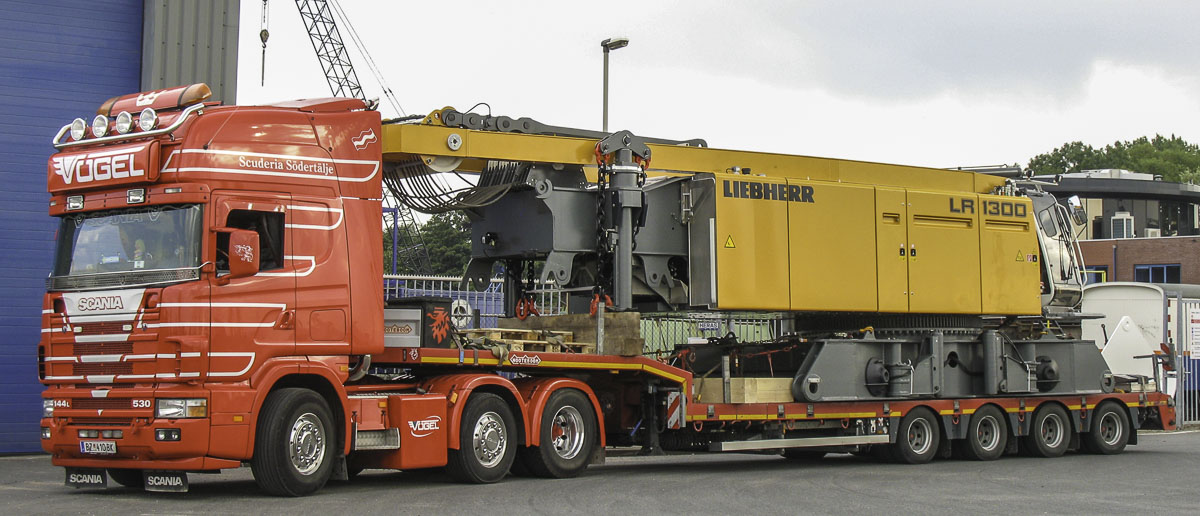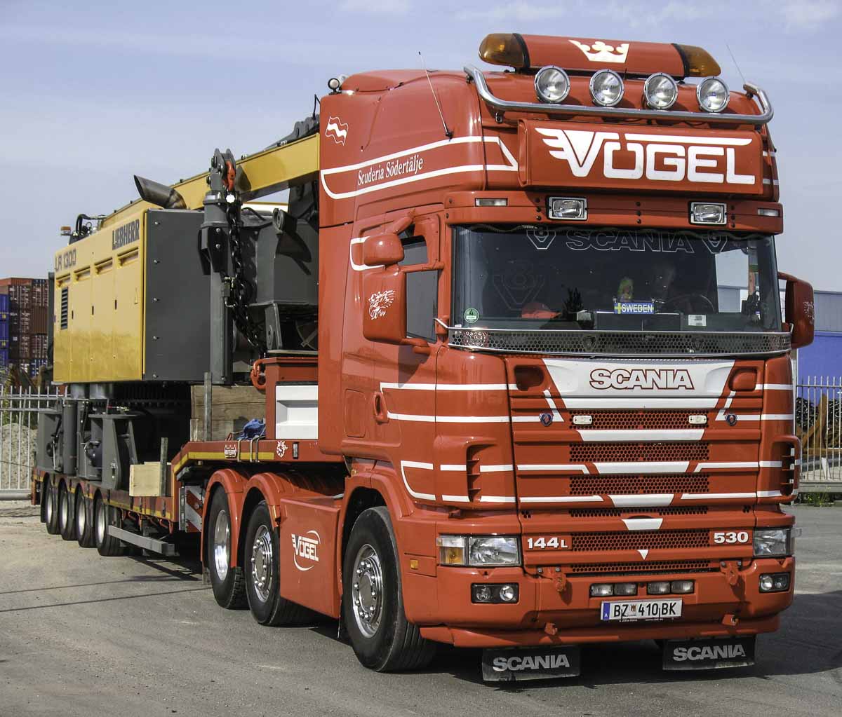 Deze fraaie Scania 144 L 530 van Vögel Transporte uit Bludesch-Gais (AT) kwam de body van een nieuwe Liebherr LR 1300 rupskraan van VEMA Crane uit Breda (NL) aanleveren. De combinatie bestaat uit een 3-assige truck met een 4-assige oplegger.